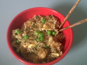 - Add the rice, peas, chicken, spring onion, cooked egg & soy sauce. Fry everything for 5 minutes or so – until the soy sauce has been all soaked up and the rice is piping hot.