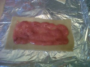 [Now it is quite important to transfer your unfilled pastry sheets to the lightly greased cookie sheet. Doing so once the paper thin parcels are full of jam would be disastrous.]