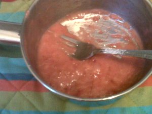 Combine the strawberries and granulated sugar in a small saucepan. This will magically become syrupy tasty sweet, extracting the juice from the berries in a process not dissimilar to decomposition.