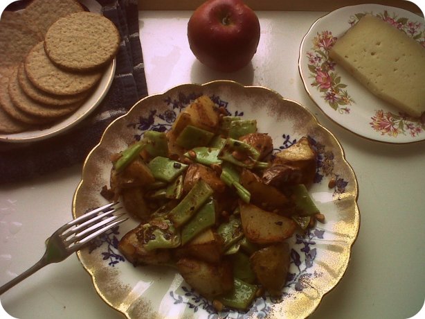 When the beans are cooked and the potatoes are hot, toss in the pinenuts for a minute or so until starting to toast.