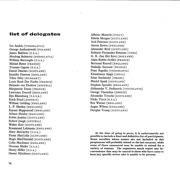 The ’62 conference is the stuff of legends – many of them involving fisticuffs. The event was reported widely in the press, and many of its debates and fierce disagreements laid foundations for the proliferation of festivals and literary events which were to follow in the next fifty years (I’d argue in an increasingly pedantic and watered-down form).
