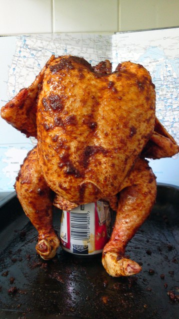Now sit the chicken on the can. Snug it down firmly so it will stay upright while in the oven.