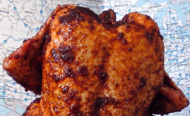 First, create a sweet and spicy rub for a beautiful chicken. With paprika and probably brown sugar. Maybe one like this.