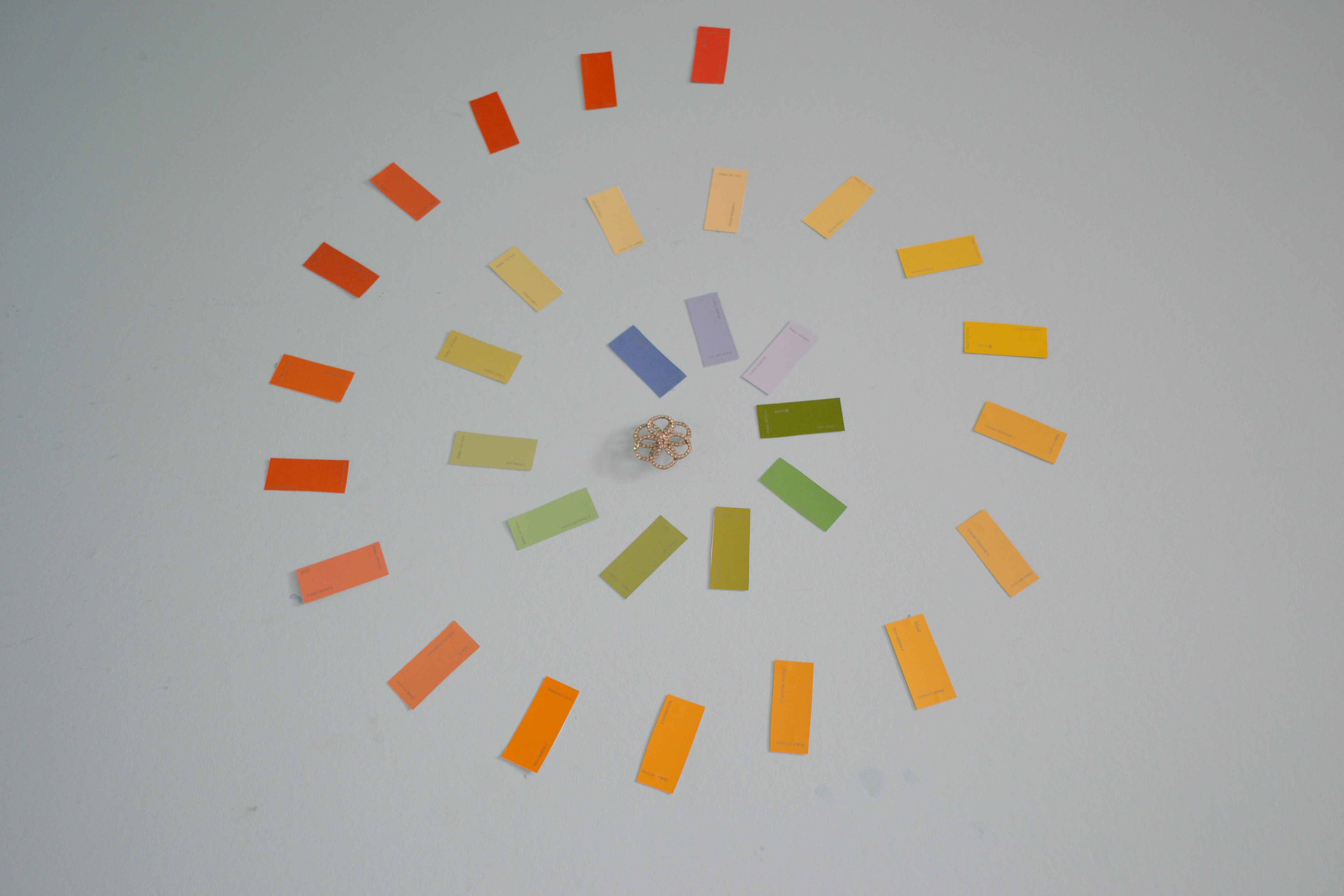 So I made a colour wheel of impromptu wall art. And stuck my much-missed Grandmother’s brooch in the middle for good measure.