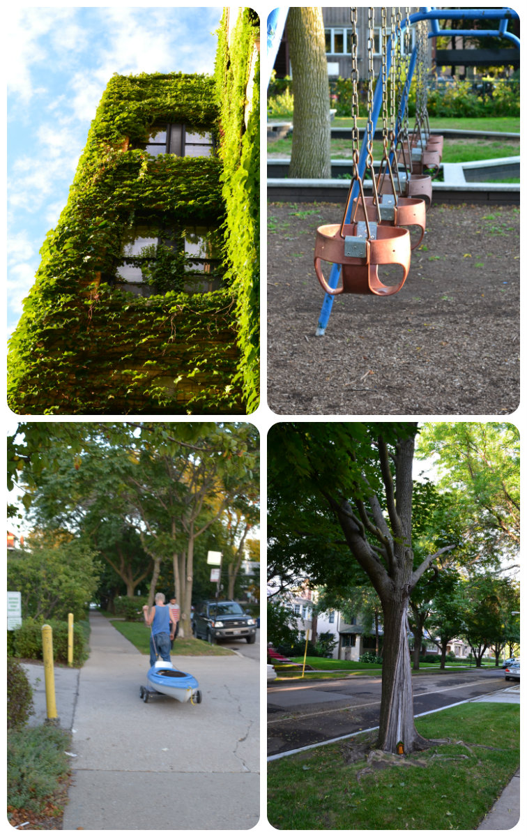 There are playgrounds and schools, a big library and the expected residential accoutrements. The guy two doors down who pulls his kayak by wagon to the shore each night is probably my favorite thing on our street. The fairy door in a split tree trunk is a close second.