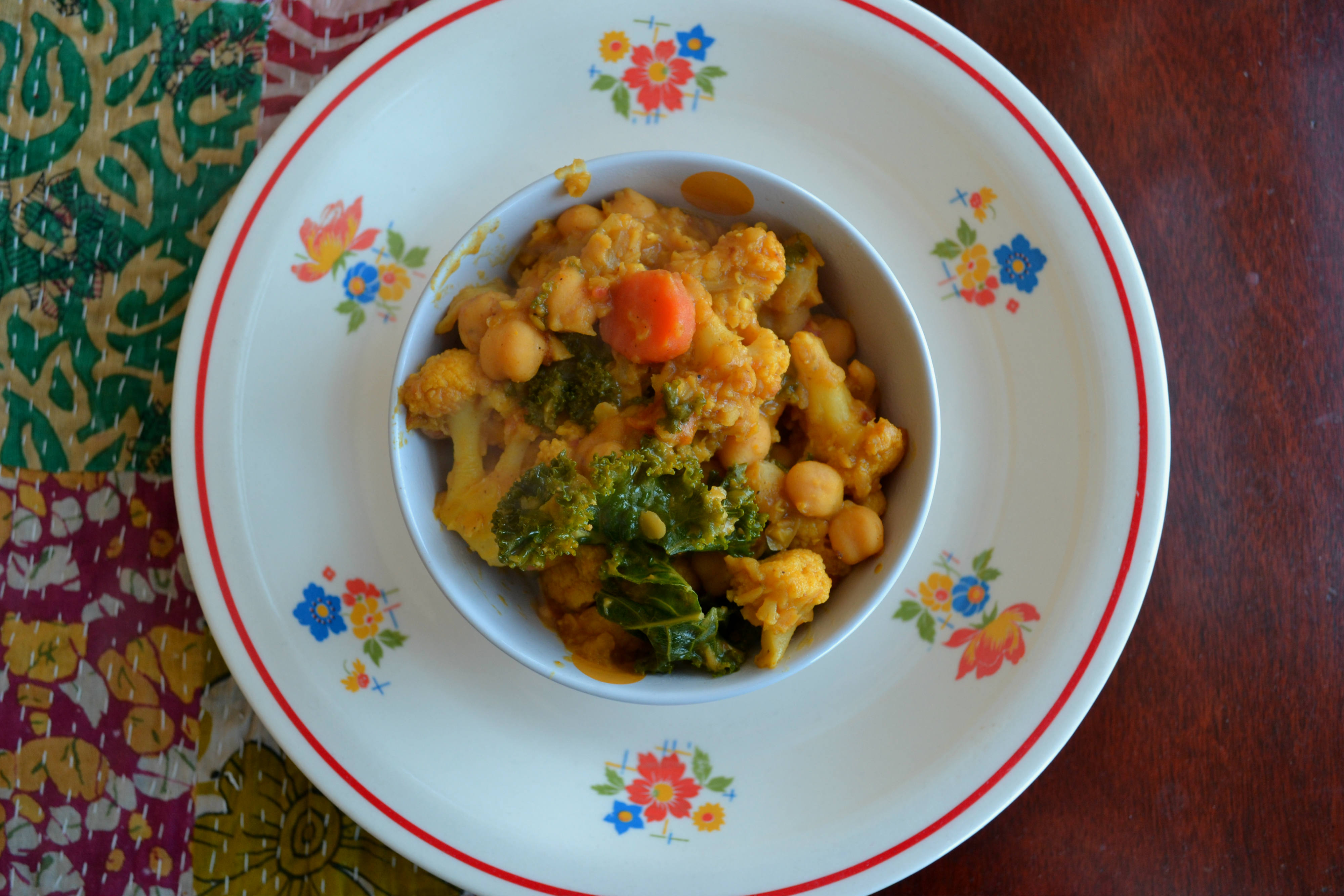 When its fragrant and the onions are soft add the garlic, chili, carrot, tomatoes, chick peas, lentils, and enough water + stock to cover. Bring to a gentle boil and simmer until the lentils are cooked and the cauliflower is done.