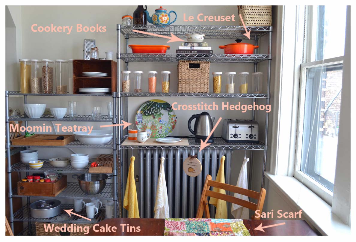 - The open slatted shelving means I can put away still-damp dishes to save precious counter-space (and are the perfect deterrent for the occasional fluffy resident of our 100-year-old brick walls).